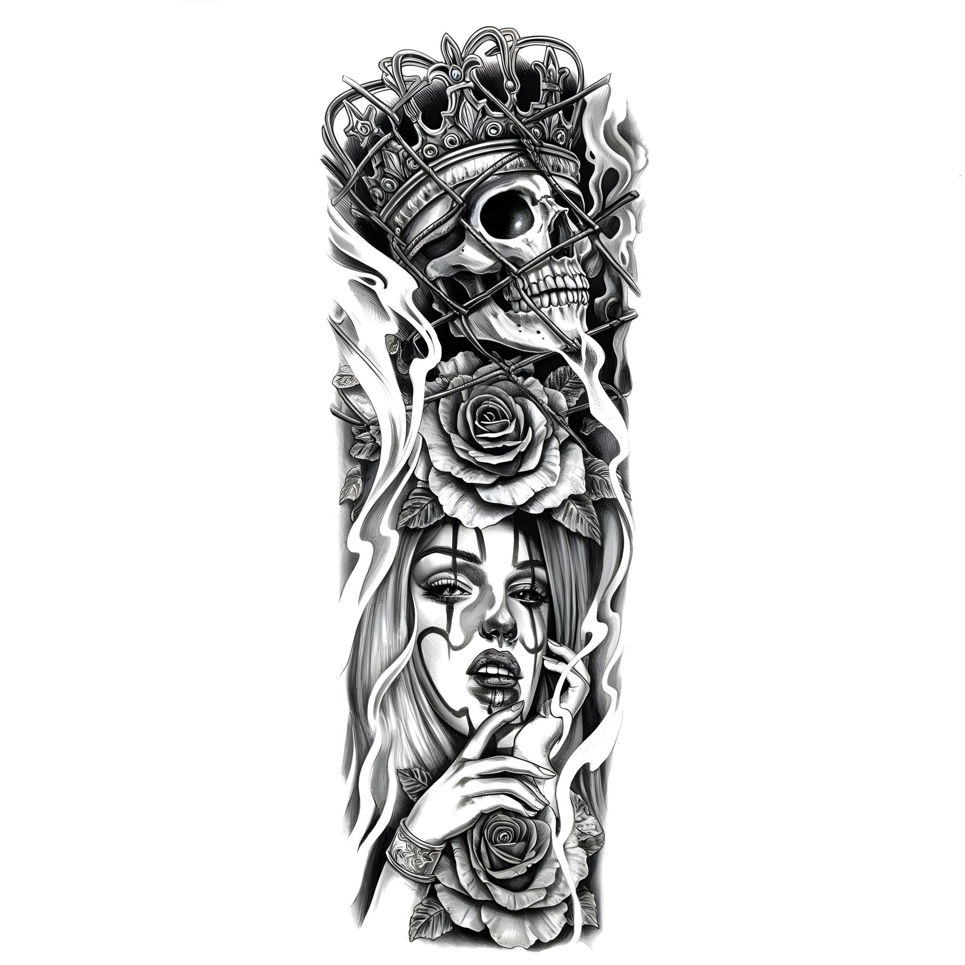Crowned Skull & Roses Sleeve Temporary Tattoo | 6 x 18 inch
